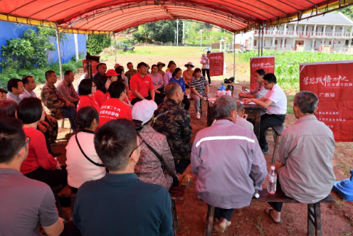 4月26日下午,活動一行人走進了浦北縣柑子根村第一黨支部。在柑子根村中心一片碧綠的田野上,擺放著整齊的板凳桌椅,村民代表相圍而坐,共同學(xué)習(xí)了一堂別開生面的“田間黨課”。