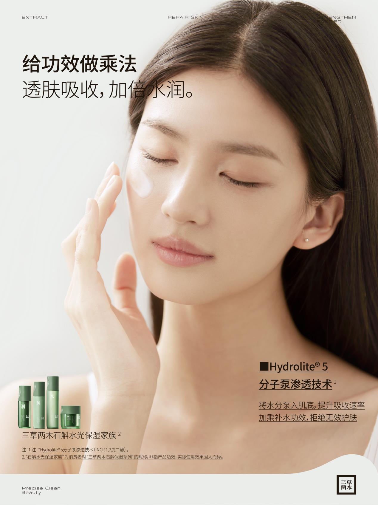 此外,三草兩木石斛系列還創(chuàng)造性地使用了Hydrolite? 5分子泵滲透技術(shù),在肌膚皮層中建立一座“輸水分子泵”,使得功效成分穿過肌膚皮層,直接泵入真皮層,大大地提升了功效成分的生物利用度,將水分切實輸送至肌底,擺脫外層濕潤、內(nèi)層干燥的“假潤”困局,幫助肌膚實現(xiàn)由內(nèi)而外的瑩潤水亮。