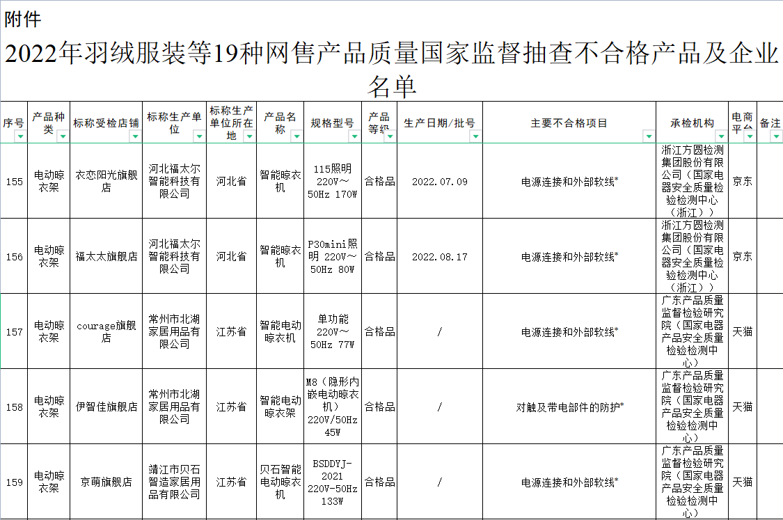 近日,市場監(jiān)管總局通報了2022年羽絨服、電動晾衣架等19種網(wǎng)售產(chǎn)品質(zhì)量國家監(jiān)督抽查情況。結(jié)果顯示,2022年度電動晾衣架抽查不合格率高達(dá)46.2%,為19種抽查產(chǎn)品中最高。