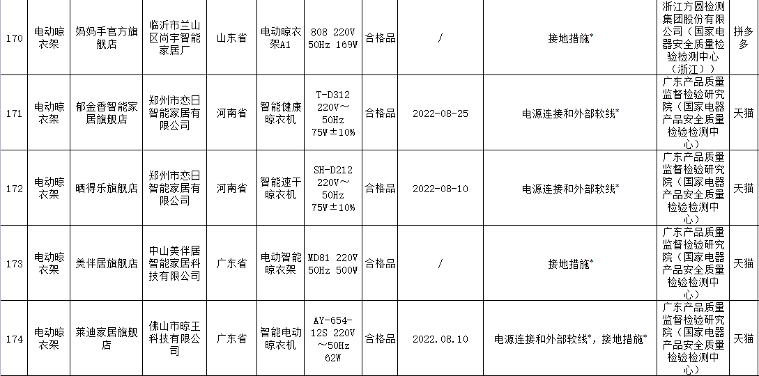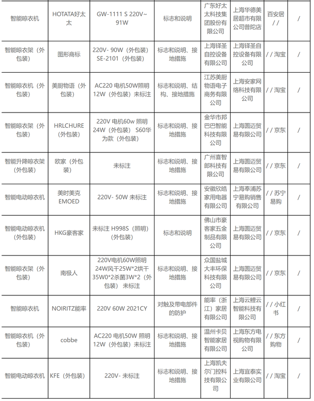 無獨(dú)有偶,據(jù)上海市市場監(jiān)督管理局發(fā)布的2022年上海市產(chǎn)品質(zhì)量監(jiān)督抽查結(jié)果(第十批)顯示,11批次智能晾衣架抽查不合格,其中涉及HOTATA好太太、美時美克EMOED、南極人等品牌。