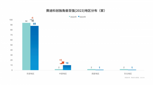 地區(qū)層面,賽迪科創(chuàng)獨(dú)角獸百強(qiáng)(2023)分布不平衡態(tài)勢(shì)依然突出,東部地區(qū)占88家,中部地區(qū)占10家、西部地區(qū)占1家,東北地區(qū)占1家,與上一年相比,中部地區(qū)增長最多,增加8家,東部地區(qū)則有所降低,但仍處于絕對(duì)領(lǐng)先地位。
